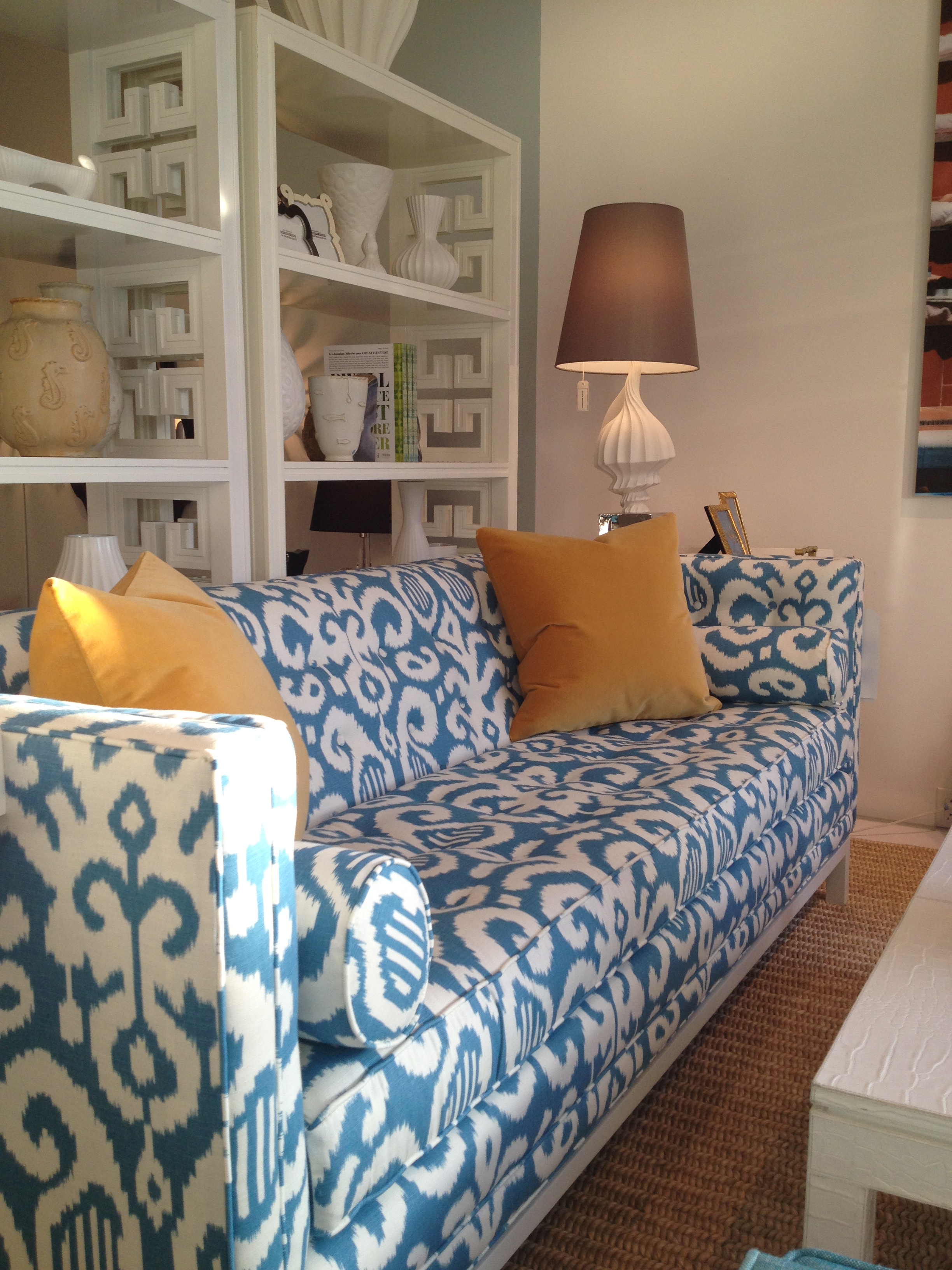 I particularly loved this mid-century style chair with a lavender, cream and coral ikat print on a blue and white chevron rug. Such a fun mix of color and pattern, don’t ya think?